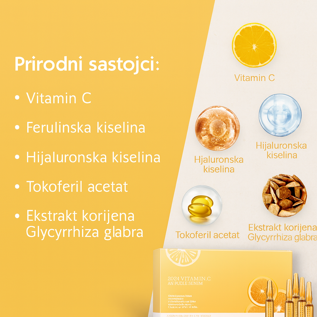 Vitamin C 20% ampule sa ferulinskom kiselinom i askorbil glukozidom posvjetljuju ten, ujednačavaju boju kože i pružaju snažnu antioksidativnu zaštitu.